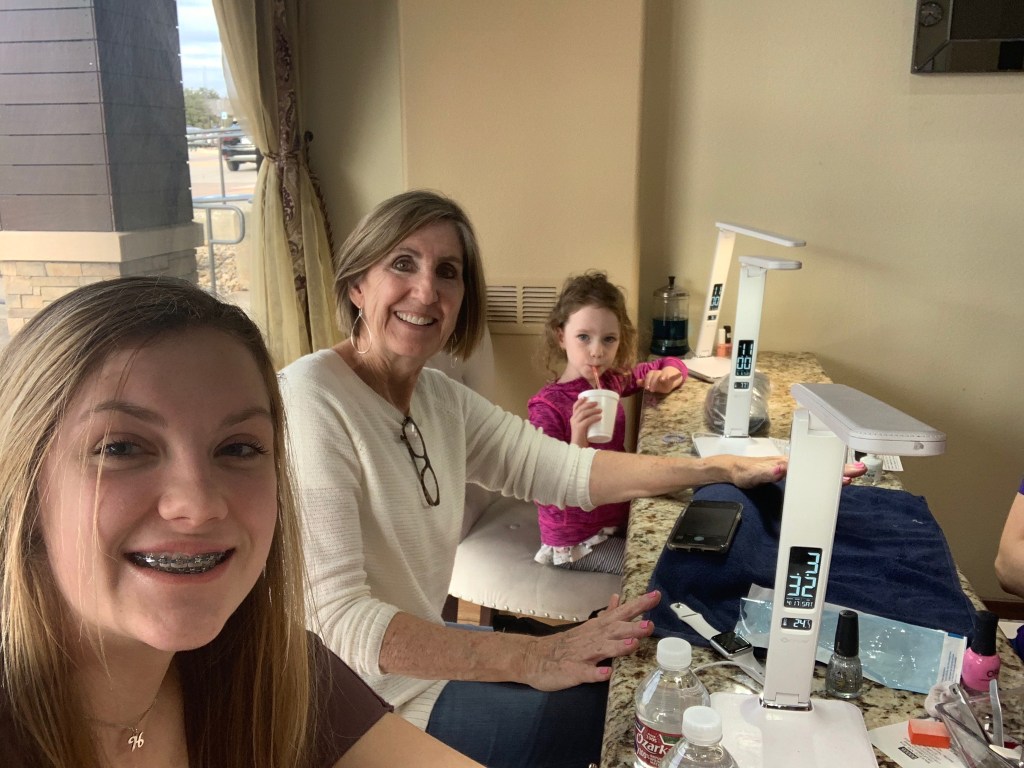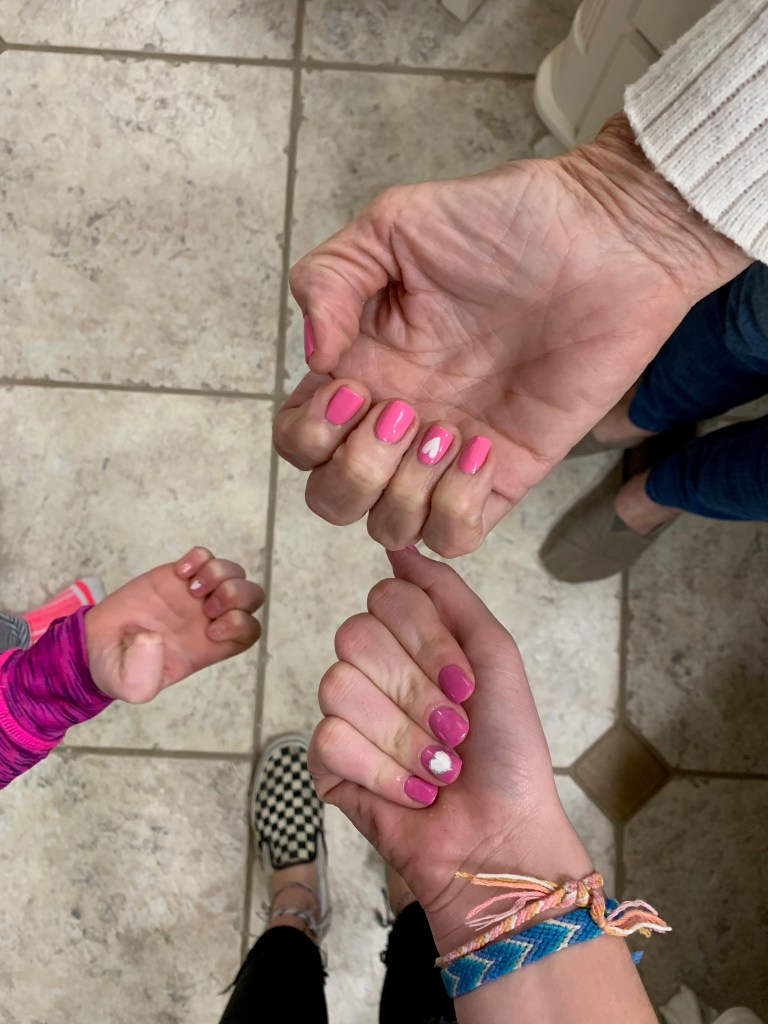 Of the twelve grands, only three are girls! I love our boys dearly, but it is always a treat to get a little special girl time! After basketball games we decided to get matching pink valentine nails with a white heart on one finger! We were cracking up because two of our technicians could NOT do a heart! Such a fun giggly day with these two! Love these girlies so much! xo